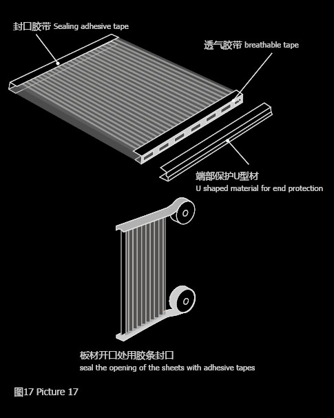 D.確保根據(jù)具體應用情況使用適當?shù)姆饪谀z帶,注意:在彎曲安裝的情況下,因為板材兩端開口均向下所以兩端都使用專用透氣膠帶封口。注意對端部封口膠帶的保護,避免在安裝型材時損壞,可以采用聚碳酸酯U型材進行保護 (圖一17C)